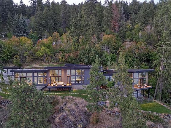 This modern masterpiece provides exceptional privacy within a gated 2+ acre setting, boasting 433' of pristine shoreline. This exceptional home is a one-of-a-kind blend of architectural excellence and bespoke design. Every detail has been thoughtfully curated by the renowned Uptic Studios, with custom finishes throughout and spectacular views of Lake Pend Oreille and the Green Monarchs from every room. Step inside and you're immediately greeted by a seamless fusion of luxury and functionality in the living room with an ornate fireplace and floor to ceiling windows showcasing coveted North Idaho scenery. The heart of the home is a gourmet kitchen designed for both everyday living and the hearth room to enjoy sophisticated entertaining. Highlights include custom Walnut cabinetry, a walk-in butler's pantry, gourmet-grade appliances, built-in espresso machine, wet bar with an undercounter refrigerator and ice maker, and polished quartzite countertops. Just beyond, an enclosed 4-season lounge that features a Lynx grill and Memphis pellet smoker, commercial-grade hood fan, wood burning fireplace and direct access to the outdoors - perfect for year-round culinary creativity. An elevated walkway leads you to the primary suite, an architectural showpiece with exposed steel beams, a private balcony, and a custom built-in bed with matching nightstands. The spa-like master bath is a sanctuary of natural light and organic textures, with limestone walls, a soaking tub, dual sinks, a walk-in shower, and an expansive walk-in closet. Two additional guest suites, each with their own private bathrooms, provide luxury and privacy for family or visitors. The oversized laundry room is both beautiful and practical, offering abundant storage, folding space, and built-in drying racks. Step outside to enjoy your own private pebble beach, a deep-water dock with a boat lift and twin jet ski lifts, plus a fully equipped outdoor pavilion - everything you need to make the most of lakefront living. This is more than a home. It's a lifestyle defined by custom luxury, bold design, and the natural beauty of Garfield Bay.