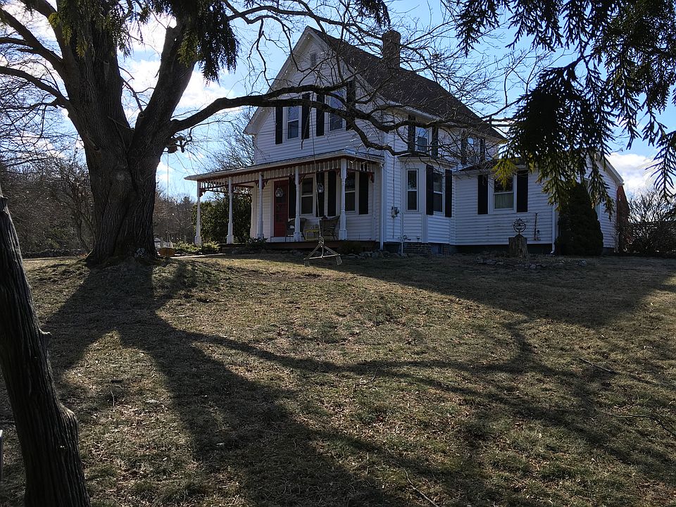 Quaint farmhouse with sweeping front porch and a fenced in backyard filled with gardens, 3 large barns, wisteria arbored outdoor patio in a peaceful country setting