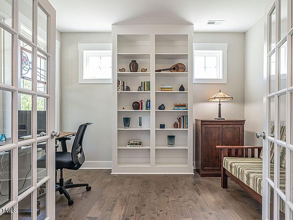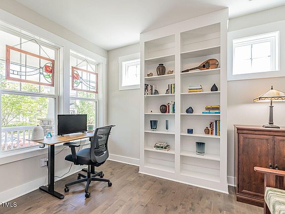 Featured on House Hunters, this delightful home in the heart of Briar Chapel combines comfort with convenience, only a stone's throw from UNC and about 35 minutes to RTP, RDU, and Duke. The first level offers elegant hardwood flooring and a main floor office equipped with French doors and sophisticated built-ins—perfect for remote work. A gas fireplace adds a cozy touch to the inviting living area. The kitchen, a chef's delight, boasts granite countertops, white shaker-style cabinets, stainless steel appliances with a gas range, complemented by a tile backsplash that extends elegantly to the ceiling. A spacious corner pantry and central island make cooking and entertaining a breeze. Upstairs, convenience meets style with all bedrooms located on the second floor alongside the laundry, simplifying daily routines. The owner's suite is a true retreat, featuring a double vanity, large soaking tub, river rock-tiled shower, and a spacious walk-in closet with custom-painted wood shelving. This home comes with additional benefits like a flexible third-floor bonus room and a screened porch ideal for enjoying quiet evenings outdoors. The backyard, which borders HOA-maintained space, adds a little extra space and features several large, impressive rose bushes. Energy-saving rooftop solar panels decrease the electric bill by $50 per month. Dive into the array of community amenities such as a resort-style swimming pool, lap pool, clubhouse, fitness center, and more—tailored for an active and engaged lifestyle. With numerous parks, trails, and social groups, Briar Chapel offers an enriching environment just minutes from major educational and tech hubs.