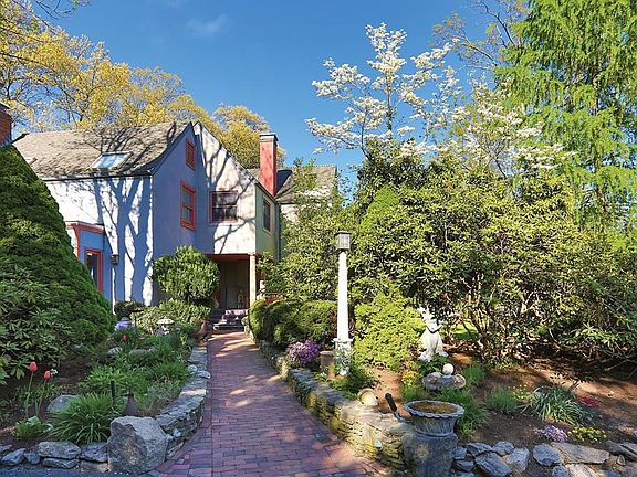 In a bucolic setting near BC campus, T stop, shopping, cinema, restaurants and sited on over half an acre of beautiful, level land, this distinctive house was originally built in 1978 with wood siding and exposed wood beams in interior rooms. In 1996, wood exterior removed and replaced with stucco and stone.The interior decor reflects its owner's highly personal, exuberant , eclectic taste. First floor features stepped down living room with fireplace, bay window. A 27'x17' family room opens out to loggia and abuts the kitchen and dining room. Second floor has dramatic master suite with cathedral ceiling. There are three additional bedrooms, a 17'x15' artist studio, and an office. A detached three car garage with loft space was also built. Basement is approximately 1276 SF with 8' ceiling. Lot size allows for significant expansion .