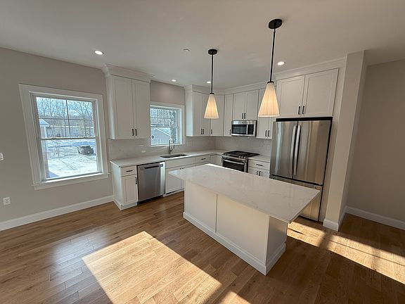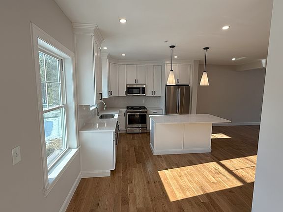 This newly constructed townhouse is located in the back of the Juniper Commons community, and includes upgraded features! Open flow living space is complete with high ceilings, hardwood flooring, custom trim work, and plenty of natural light. The living room leads onto the deck, which offers views of the wooded open space and easy access to the community trail. The upgraded kitchens feature cabinets to the ceiling, large island, bar with pantry cabinet, and quartz countertops as well as a separate coffee bar also featuring a quartz countertop. The third floor has three bedrooms, with a primary suite including walk-in closet and private bath with tile shower. Hardwood flooring throughout all bedrooms, living area, and stairs. Two car garage. Central air. Professionally landscaped community with community park, sidewalks, and trail leading into the lush open space. Enjoy low maintenance living in a great Portsmouth location! Please note that showings will start 2/24/2025 and are unfortunately not possible prior to then. Initial lease term is 16 months starting 3/1/2025. 12 month renewals possible. Tenant is responsible for the utilities including electricity, natural gas, and water.
