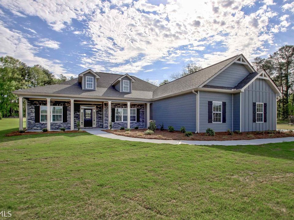 WE ARE HAPPY TO OFFER IN PERSON TOURS OR VIDEO CHATS AT THE HOME AS WE TOUR THOUGH WITH YOU LIVE ON LINE- call for details***This ranch has it all! Stone accents & COLOR PLUS concrete siding makes this a low maintenance home that will fit everyone's needs*Large open spaces when you enter w/ coffer ceiling dining room, great room w/ fireplace, open kitchen & breakfast*Additional space upstairs with a full private bedroom & bath (great for the teen or guests or home office)*Kitchen boasts a large breakfast bar island, spacious pantry, granite counter top & upgraded ss appliances *Owner's suite w/ tray is very large & open w/ vaulted sitting room at rear + elegant bath w/granite, sep garden tub, tile shower & tile floors + oversized walk in closet*Hardwood flooring in foyer, dining, kitchen & breakfast*granite & tile floors in Baths*Rocking chair front & Game Day rear porch with fireplace & 55" TV included!*Attached 3-car garage with side entry