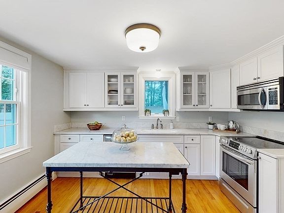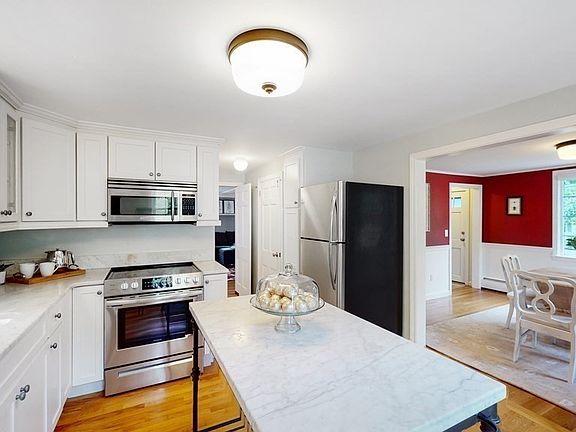 Gambrel Cape style home in South Acton down the street from Cucurbit Farm. Hardwood floors throughout the first two levels. The beautifully updated kitchen includes all shaker-style cabinets, a marble top island, and brand new stainless steel appliances. Sun-drenched front-to-back living room with fireplace, dining room with the original built-in corner cabinet, and bath complete the first floor. Upstairs has three (3) spacious bedrooms and an updated full bath. The basement includes a bonus room with fireplace and additional storage. Double French doors located off the living room, lead you to the two-tiered outdoor deck that overlooks the sweeping fenced-in backyard featuring mature landscape and a direct walking path to Barker Pond. Easy access to the commuter rail, Rte. 2, and Rte. 27. Top-rated public school district.