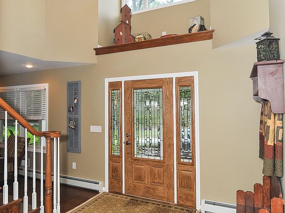 Immaculate 4 bedroom colonial with detached 2 car garage on private 2 acre lot. Open kitchen with stainless steel appliances, 42 Inch maple cabinets, granite tops, wet bar with wine fridge, and breakfast bar. Spacious rooms Including 1st floor study, formal living room, dining room, family Room with wood burning fireplace. Custom oak hand scrapped floors throughout. Master features teak floors, recessed lighting, sitting area, large walk-in closet, master bath with shower and whirlpool tub and custom built in cabinets. 3rd Floor bonus room great for game room or play area. 4 Zone hot water baseboard heat and 2 zone central AC. Professionally hardscapped yard with custom paver patio, Gormet BBQ and pool area with water fall and fire pit. Perfect yard for summer entertaining!