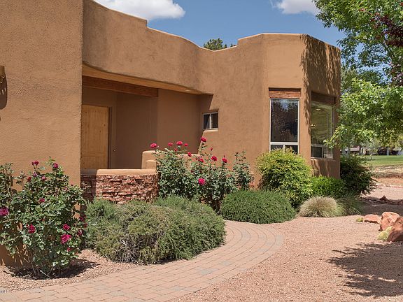 Peaceful setting on Oak Creek Country Club Golf Course (10th tee). Beautiful, unobstructed red rock views! Professionally landscaped. Courtyard entrance with unique fountain. Open floor plan is great for entertaining. Three bedroom plus a den that could be used as a fourth bedroom. Fireplaces in both living room and master bedroom. Large attractive master bath with separate travertine shower enclosure and whirlpool bath. Kitchen has stainless steel appliances and granite counter tops. Fully fenced yard with large water feature. Adjacent owner-owned 1/4 acre building lot (not included in lot size), provides protection for magnificent red rock views.