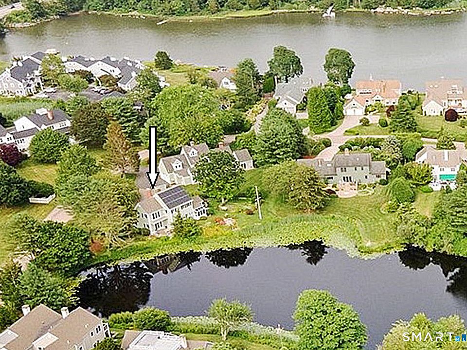Direct waterfront on Quanaduck Pond. This 3 Bedroom, 4 Full Bath, 3,005 Sq Ft Contemporary Colonial is nestled on .35 acres of refined waterfront and includes energy efficient owned solar panels and wired for a generator. Enjoy a shared association dock and paddle/racquet court all in this coveted association and location. The exceptional floor plan features a spacious living room with a wood burning fireplace and direct access to a flagstone patio overlooking the water. The dining room also open to the patio and enjoys expansive pond and distant views, creating an ideal setting for indoor-outdoor entertaining. The generously sized kitchen includes a breakfast nook, greenhouse window, and is complemented by a rear entry foyer and dedicated laundry room. A private en-suite bedroom over the garage with a full bath offers flexible space for guests, a home office or studio. Upstairs in the main residence is the Primary Bedroom Suite, complete with a private balcony overlooking the pond, walk-in closet-perfectly suited for a nursery or small sitting room enhansed by a skylight. The Basement features a six-foot-wide ramp from the garage, providing convenient storage for boats, kayaks, or other recreational equipment. Serviced by municipal water and private septic system. Set on approximately one-third acre, this property is beautifully landscaped and thoughtfully treed, offering exceptional privacy. Near Stonington Borough.