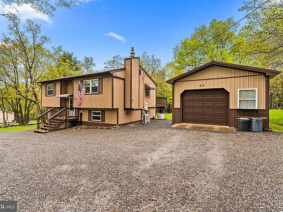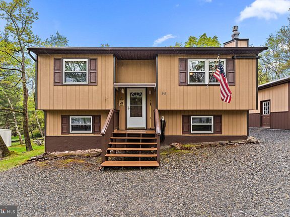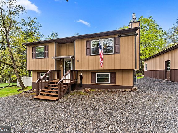 Welcome to 45 Quincy Lane, a charming retreat nestled in the Indian Mountain Lakes community. As you approach this delightful bilevel home, you'll be captivated by its expansive 1-acre lot. The property also features a newer detached, oversized 32 x 18 one-car garage, perfect for car enthusiasts or hobbyists seeking extra space for their projects. Step inside and walk upstairs to the main living area, where an open floor plan greets you. The spacious kitchen features stainless steel appliances, an island, and sliding glass doors that lead to an expansive deck. The deck features a retractable awning and is the perfect spot for morning coffee or evening relaxation, offering stunning views of the property. Adjacent to the kitchen, the dining area seamlessly flows into the inviting family room, where a cozy propane fireplace adds warmth and ambiance. Continuing on the upper level, you'll find two generously sized bedrooms, each offering ample storage space, and a full bathroom. Descend to the lower level, where an additional cozy family room provides more space for entertainment and relaxation. This level also includes two more generous size bedrooms, a convenient laundry room, a second full bathroom and an another exterior door with ground level entry. Each room in the house has an individual thermostat, allowing for economic savings when rooms are not in use. Three split duct units provide additional heating options, and air conditioning on warm summer days. This lovingly maintained home has been cherished by its owners for 17 years. Its spacious living area and serene setting make it ideal for those seeking a peaceful getaway. The home is also equipped with an automatic propane whole house generator for extra piece of mind. Indian Mountain Lakes offers a wealth of amenities in a gated community setting. Enjoy access to five picturesque lakes, perfect for fishing or a tranquil paddle, two pools, multiple playgrounds and swimmable beaches, tennis courts, a club house and scenic trails provide endless outdoor activities. Conveniently located near ski resorts, Jack Frost and Big Boulder, catering to winter sports enthusiasts, as well as proximity to Hickory Run State Park, Pocono Raceway and so many other Pocono attractions.