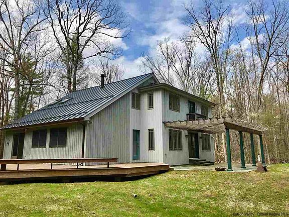 There's a Swedish vibe going on at Silo House, a privately sited contemporary home in the woods. The spacious interior and versatile layout were designed for entertaining and hanging out, whether in front of the wood stove in the living room under vaulted ceilings, or in the great room, with its beamed ceilings and French doors which open to the pergola-covered bluestone patio. For the serious cook, there's a Garland range, salamander/broiler and stainless hood, as well as butcher-block countertops and solid wood cabinetry. There's an open stairway from the living room to two bedrooms that share a bathroom, and another stairway hidden inside the copper-domed silo to a third bedroom and bathroom. And when there are more overnight guests than beds, there's a third full bathroom off the great room for the couch surfers. Hardwood floors, skylights and thoughtful use of wood accents enhance the comfortable and calm environment. Systems are in top shape and have been impeccably maintained; with three heat sources, there's every opportunity to operate the home with the utmost efficiency and there's central air conditioning too. Outdoors there are trails through the woods and the perfect spot for a pool in front of the deck, which wraps around two sides of the house. There's plenty of storage space in the house, as well as in the shed and the space above the detached two-car garage. Silo House is located at the north end of Minnewaska State Park and near to the Mohonk Preserve and countless attractions and historic sites. Essentially there's nothing for a new homeowner to do here other than to move in and begin enjoying this gem of a home.