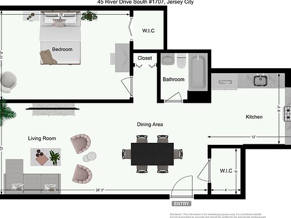 Available for immediate move in, this high floor spacious 1 bedroom is located in the amenity filled 45 River Drive S building. Fully renovated bathroom. Large bedroom can easily accommodate a king and additional furniture. Kitchen has new stainless refrigerator and dishwasher. Full time doorman, renovated building amenities, including club room, gym. New washer/dryer on each floor. Pet friendly. Close to Newport PATH station and light rail. Quick access to shopping, parks and waterfront. Rental parking is available in the garage.