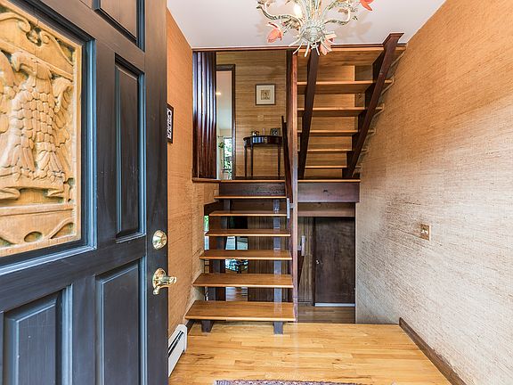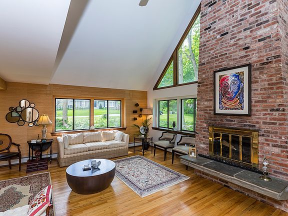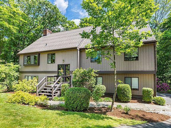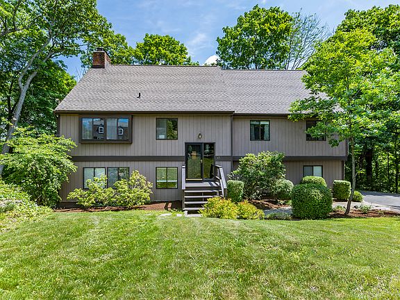 Contemporary on cul de sac close to town center. House has a large entertaining Great Room with double height vaulted ceiling, fireplace with raised hearth and walls of windows overlooking large deck with woods beyond. Large eat in kitchen with center island, sky lit and direct access to deck. Three bedrooms and bath on main level. Upper level has master bedroom suite with over sized master bedroom, dressing room, new master bath and large walk in closet. Off the master bedroom suite there is a vaulted ceiling sitting room, office or could be 5th bedroom and a loft overlooking the great room-living and dining. Lower level has new large full bath with walk in shower, family room with fireplace and fabulous expansive deck. In addition, there is a large utility room and laundry room. Great commuter location and walk to town in minutes.