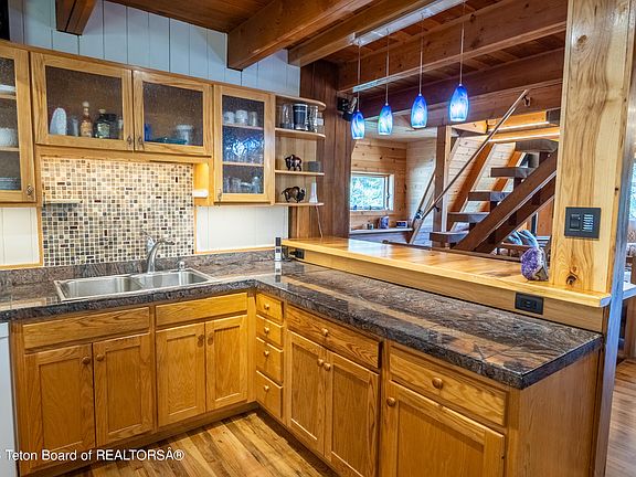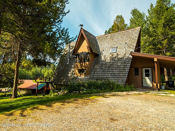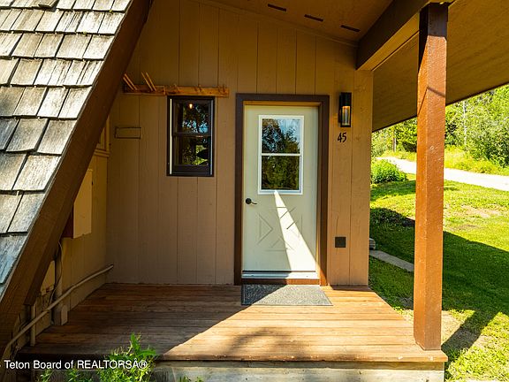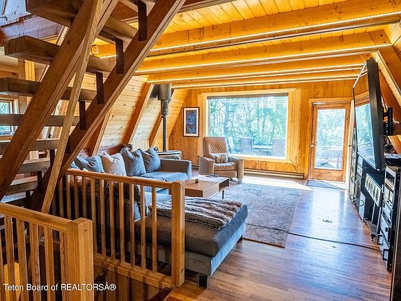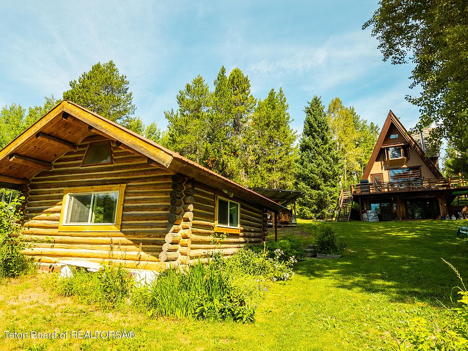 Situated on a loess covered verdant bluff, this very private 2-bedroom, 2-bath home offers the ultimate convenience to Wilson and outdoor activities. Lovely pastoral views to the east and south over the Fish Creek Ranch, as well as bordering the conserved ranch to the north. Expansive windows flood the interior with natural light, bringing the outdoors in. Vaulted ceilings and exposed beams create an open, inviting ambiance. Many upgrades have been done to the main house including: some electrical work completed, trenching for Starlink internet, firepit with outdoor audio system, new propane tank, new picture window facing the south, smart thermostats installed, custom motorized shade, new exterior lighting, under cabinet lighting, new tongue and groove ceiling boards with fresh insulation on north walls. High-end furnishing package would possibly be included. Guest cabin included.