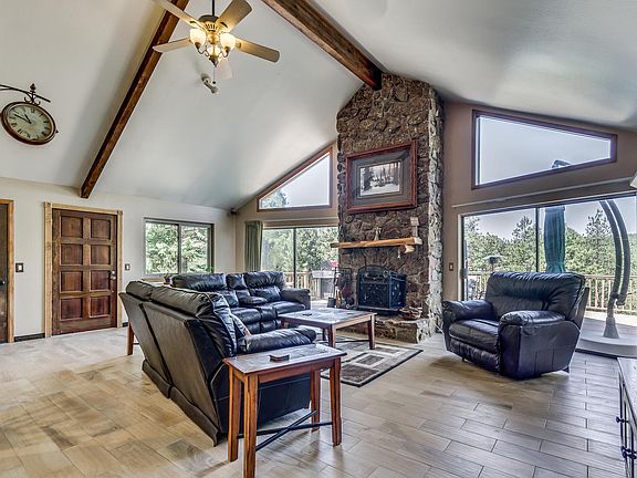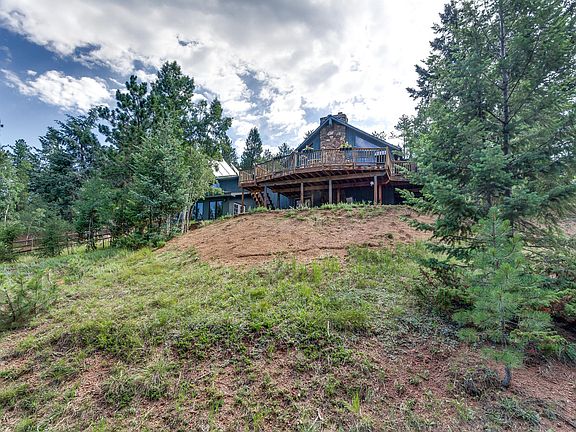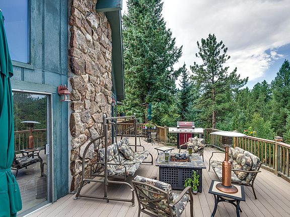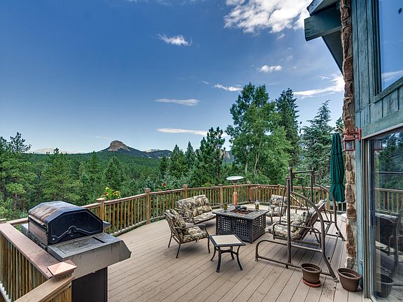 Wonderful mountain home with so many possibilities! JeffCo Schools! Relax or on your maintenance free deck, overlooking the majestic mountains, rock formations and wildlife. At night, watch the headlights come down Mt. Evans! 5 bedrooms, 3 baths, and beautifully updated baths. Kitchen is light, bright, and open to the great room which boasts 15' ceilings and a stunning floor to ceiling stone fireplace. Watch our beautiful Colorado weather from the floor to ceiling windows. Open floorplan! Basement boasts a HUGE family room, game room with pool table- included, bedroom, den, and another must see custom bath with extra long claw foot tub. This wonderful home sits on almost 3 acres and is zoned for horses. Outside you will find a large chicken coop/garden area, spa/hot tub for relaxing, plenty of parking for all the guests you will be entertaining, and RV parking with FULL HOOK-UPS! Save on utilities with solar! Too many extras to list. School bus stop is right around the corner!