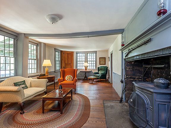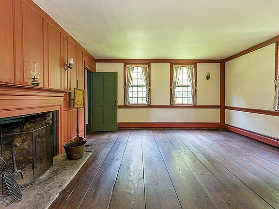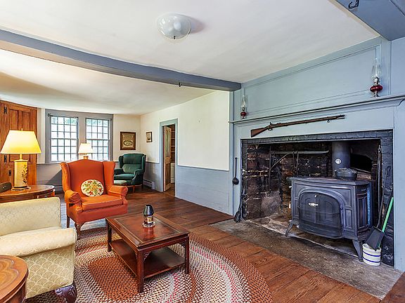 Village living at its best! Historic 1763 William Cressey homestead, surrounded by 6 Ac. of protected land/Flanders Nature Center, is in the Historic District only a 5 min. walk to shops/PO/library/tennis courts - and just around the corner from the elementary school. Picture perfect setting is frozen in time from the saltbox roofline to the split rail fencing and barn. All the authenticity that is promised on the outside is present on the inside: wideboard floors, 5 FPs, original paneling & wainscoting. The library walls have an extraordinary mural of Woodbury scenes painted by a previous owner/artist in 1933. First time on the market in 37 years!