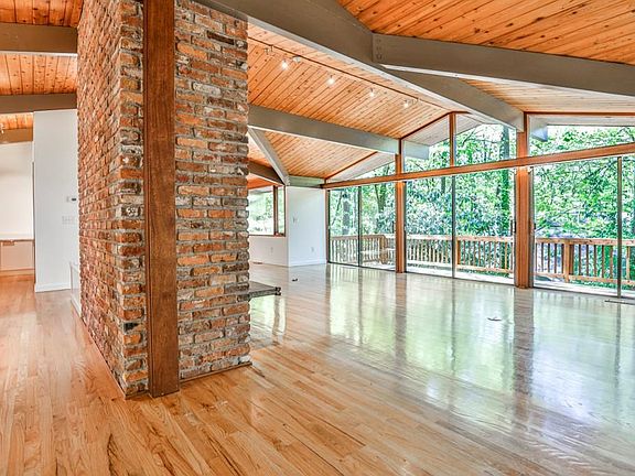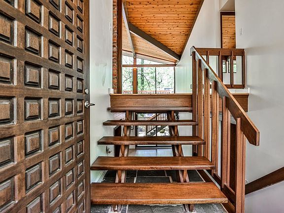 Rare opportunity to own this unique "deck house" with post and neam construction. A combination of slate and oak flooring with mahogany doors blends seamlessly with tongue and groove soaring cedar ceilings. The owners meticulously renovated the bathrooms, choosing tiles and other materials that blend perfectly. The new kitchen is breathtaking, sleek and sophisticated including a waterfall center island. The walls of windows make this home open and airy yet private with gorgeous views of the blooming, private lot. The fenced back yard is flanked with a new outdoor kitchen including sink and grilling area. The owners waterproofed the underside of the deck so that this space can be utilized in rainy weather. New HVAC and deck only add to the value of this one of a kind property. Living room and lower family room both flanked with impressive masonry fireplaces.