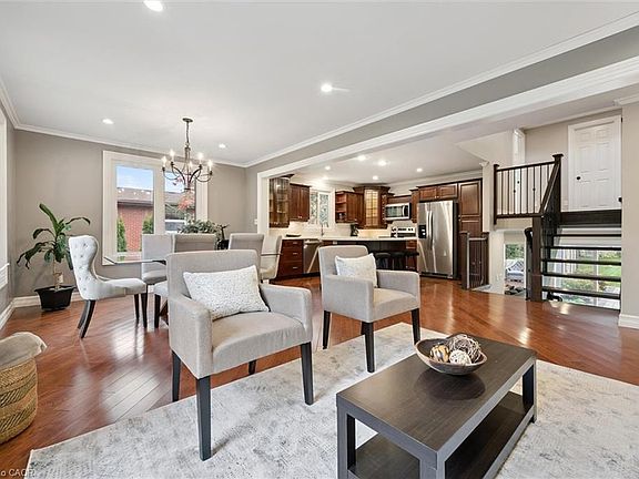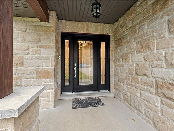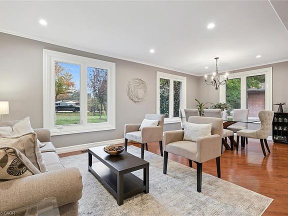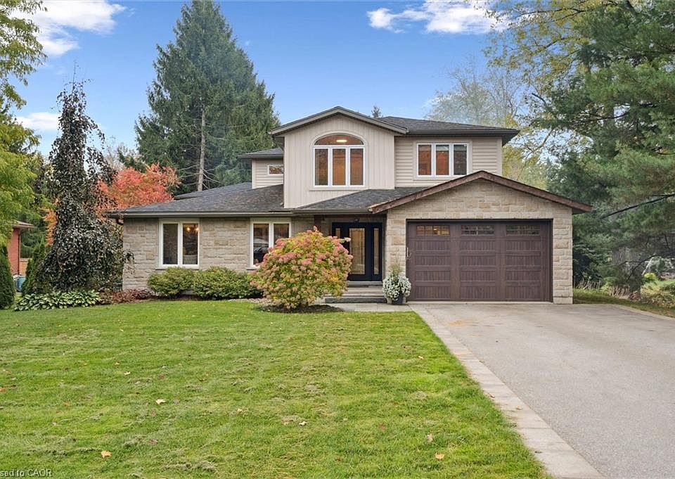 Tucked away on over an acre of peaceful, tree-lined property, this thoughtfully renovated multi-level home offers a rare blend of space, style, and soul. From its inviting front porch to the rustic entertaining space out back, every inch of this 5-bedroom, 3-bathroom property invites connection with family, friends, and the natural beauty that surrounds it. Upon entrance, you will quickly fall in love with the open-concept design, enhanced by gleaming hardwood flooring. The chef-inspired kitchen showcases sleek Corian countertops, custom cabinetry, and a functional island that flows perfectly into the combined living/dining room, creating an elegant space for entertaining. A sizable main floor bedroom is ideal for guests or a home office, while a well-equipped mudroom supports busy family living. Descend to the show-stopping lower-level family room, anchored by an attractive fireplace, and flaunting vaulted ceilings, engineered hardwood, skylights, and floor-to-ceiling windows capturing breathtaking backyard views. The adjoining games/rec area is designed for fun and function, complete with heated floors, backyard access, and a modern 3pc bathroom. Upstairs, the 2nd level provides 2 generous bedrooms and a loft space, perfect for a reading nook or study, alongside an updated 4pc bathroom. The private, 3rd level offers a primary suite with a walk-in closet and a 5pc ensuite, as well as a 5th spacious bedroom. The finished basement extends a versatile living or recreational space, complemented by a dedicated laundry room and storage/utility room. Step outside and prepare to be captivated: a 2-tier stone patio frames alfresco dining and a rejuvenating hot tub area, while the rustic post-and-beam gazebo with a striking stone fireplace promises memorable evenings under the stars. Surrounded by mature trees and lush green space, this property evokes the feel of a private resort retreat- just minutes from essential amenities and ready to welcome your next chapter.