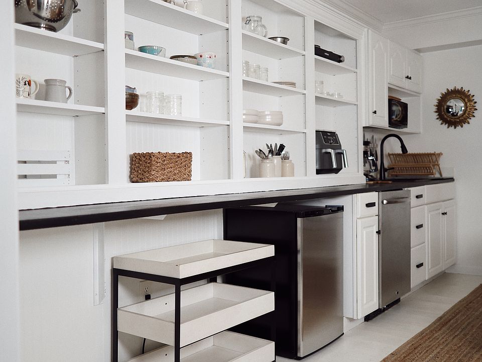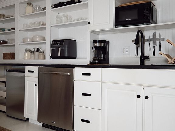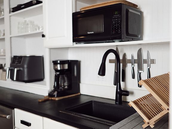 Dining/Workspace: Air fryer, hotplate, half fridge/freezer, microwave, dining area, and bathroom with a walk in shower. Two steps separate this from the living room.