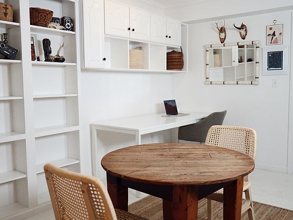 Available January 1st to April 1st, this peaceful, minimalist, fully furnished studio in North Hampton, NH, offers an open-concept layout with bohemian touches. Framed maps and global memorabilia add character to this clean, calming space.