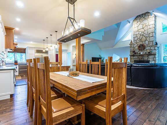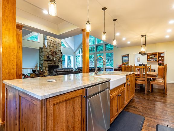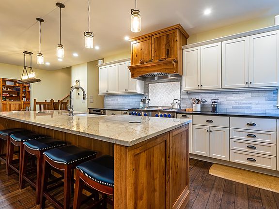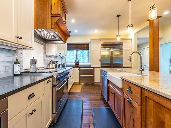 Mountain Home Living! This four-bedroom and five-bath home boasts a bright and spacious interior thanks to the vaulted ceilings throughout. The layout allows for a great separation of space for guests to come and stay to enjoy skiing, biking, hiking, or a stroll over to Tom's Loft Tavern for a bite to eat. The owners have kept this home very well-maintained and completely renovated the kitchen on the second level to a modern open layout with an oversized island and custom details throughout. The expansive custom kitchen blends into the dining area and the oversized living room with a fireplace and soaring windows. The kitchen boasts a large pantry, stone countertops, high end appliances and many extras like pop up outlets in the island and additional refrigerator drawers. Work from home in the nice office space with custom built-ins, located off the kitchen. This ski home is just down the road from the Clocktower Base area of Okemo Mountain so you can easily jump on the slopes or listen to music at the aprs ski party at the Sitting Bull Lounge. Although this home is conveniently located, it provides so much privacy with an oversized lot and yard with room to play. Have a cocktail in front of the wood-burning fireplaces in either the living room or game room. Soak in the views from the top-floor family room with vaulted ceilings and lots of windows to make you feel like you're in a treehouse! Subject to ROFR