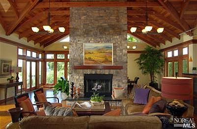 On a large parcel on a cul de sac in Tiburon premier area, this contemporary home features a gourmet kitchen, a large living /dining room, 4 en suite bedrooms, a library/office, a family room/media room, decks, outdoor kitchen, Jacuzzi, terraced gardens and a 2-car garage.A manicured garden separates the house from the street, resulting in complete privacy. The open floor plan, kitchen, living and dining with high cathedral ceilings, the use of wood, plus an imposing fireplace convey the feeling of a comfortable lodge. This great room opens to a large view terrace on one side and to an outdoor kitchen on the other. The master bedroom on the main level opens to the large view terrace with a Jacuzzi next to a fireplace. A library with built-ins has direct access to the street via a path on the side of the house; this is a great feature for a home office. The upstairs bedroom opens to a view terrace, whereas the 2 downstairs bedrooms flank the family/media room and open to the garden.
