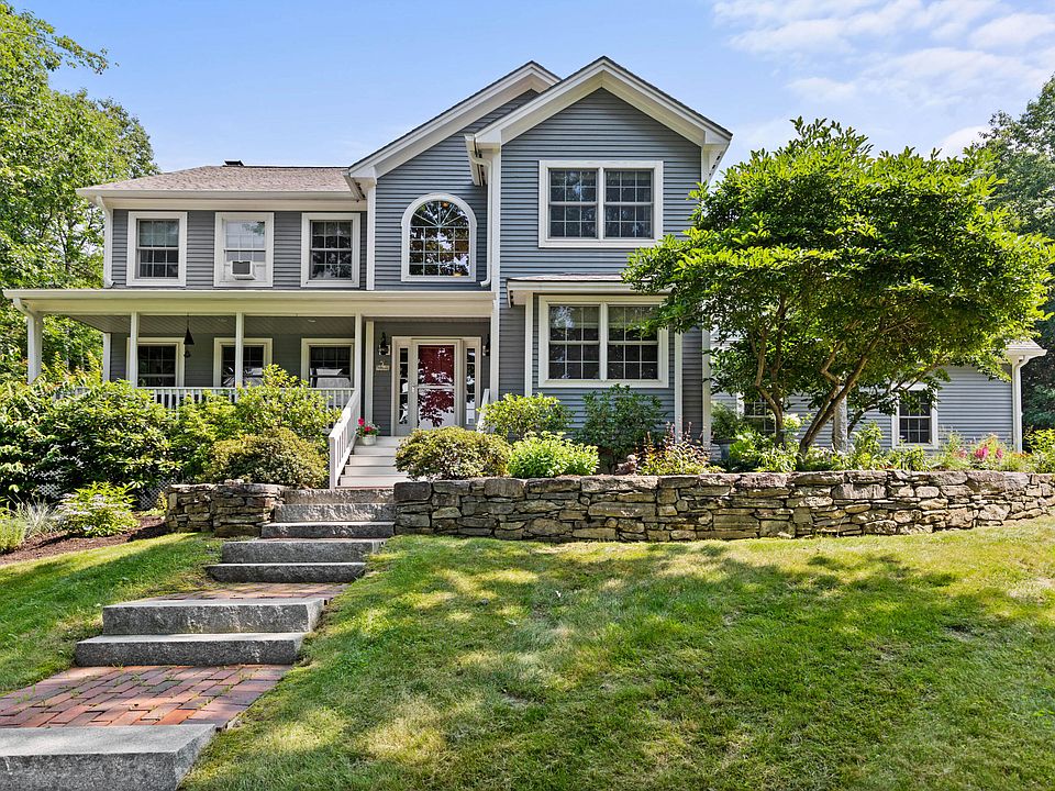 First time this home is for sale!! Beautifully maintained and updated spacious Southern colonial sits on 2.48 acres. This home offers 4 bedrooms, 2.5 baths, newly renovated kitchen with quartz countertops, beautiful back splash, maple shaker cabinets. with eat-in nook, large living room with stone fireplace, dining room, 1st floor laundry room, a large bonus room with built in's and a finished basement with a bar. Entertain in several outdoor areas including the charming front porch, back deck, patio and or large fenced in pool area. Swim in the kidney shaped heated salt water Gunite pool and take in the exquisite landscape and hardscape. Conveniently located in a top rated school district, this private oasis is a must see!