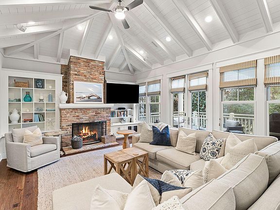 Just moments from the boardwalk and set in a remarkably private pocket of WaterSound Beach, this refined coastal retreat pairs serene dune and lake vistas with immediate access to community amenities. The setting is exceptional, framed by manicured green space at the rear, a pond across the street, and permanent views of Camp Creek Lake meeting the gulf's emerald horizon. Steps from the pool, outdoor lounge, and beach walkover, the home feels woven into its natural surroundings while offering the comforts of a full-time residence.Crafted with classic architectural details inside and out, the four-bedroom main home and detached one-bedroom carriage house create a rare, versatile offering. Two primary suites in the main home accommodate multigenerational living, while the carriage house complete with a full kitchen and private bath welcomes guests with its own sense of retreat. Throughout the residence, rich hardwood floors, vaulted ceilings, and thoughtful built-ins elevate every space.