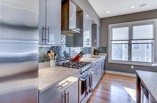 Snow is coming, how good does garage parking sound?? Beautifully designed 2 bedroom, 2 full bathroom condo in elevator building. Condo offers spacious layout with an open concept kitchen flowing into the living room. Kitchen features stone counter tops, stainless steel appliances, and 42-inch cabinets. Owner installed large center island with stool seating and a built-in wine and beer fridge. Enormous master suite offers built-out walk-in closet and ensuite bathroom with rainfall shower head. Unit offers abundant natural light throughout the space. Washer/dryer in unit. One deeded, garage parking space with elevator access included. Building offers enormous common roof deck with furniture, outdoor lighting and spectacular city and water views! Just one block to the ocean. First showings during OH 2/9!!