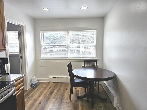 Modern light fixtureRenovated bathroomDining roomGranite countertopsStainless appliances