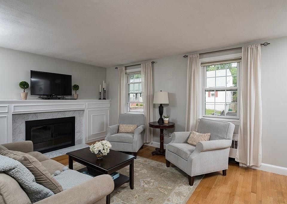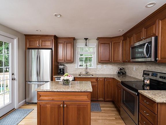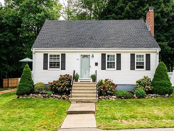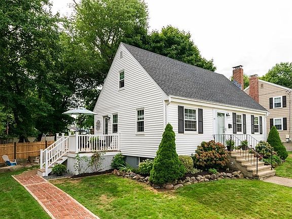 Updated & move-in ready charming cape on quiet cul-de-sac setting! 3 bedrooms/2 bath cape with updated kitchen including stainless appliances, island and hardwood floors. Both bathrooms are tasteful with current tiles and finishes. Kitchen flows into dining room with built in cabinetry for dishes. There is also a fireplaced living room and one bedroom on the main level which is currently being used as a family room as well as a full bath. Upstairs are 2 generously sized bedrooms with a full bath including a tub/shower. Basement is finished with playroom and office as well as storage. Yard includes a deck, patio and shed. Setting is amazing! At the end of a quiet street and cul de sac with convenient access to Route 3, restaurants and shops. Welcome home~