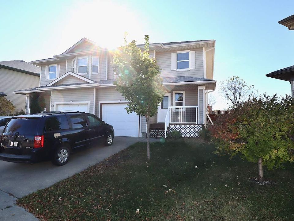 Welcome Home! Perfect 4 Bedroom 2 Story Fully Finished Duplex with Huge Pie Shaped Lot and Single Garage in Fort Saskatchewan. Great location close to everything in Westpark Fort Saskatchewan. Main floor has half bathroom. open concept living room kitchen area with corner fireplace. Dining area leads to back yard with large deck and truly oversized private back yard. Fully fenced and tons of space. South facing back yard. Finished basement with large rec room and bedroom. Shingles done in 2018. Top floor is wonderful with Top Floor Laundry Room! Master bedroom has full bathroom ensuite. Total of 3 Bedrooms up. Single attached garage. Move in ready.