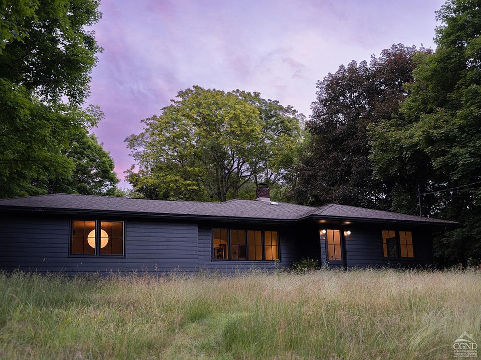 This beautifully refinished and expertly curated 1960's home is located 3 miles from the center of Rhinebeck Village. The stylish black exterior is sited in the middle of a picturesque lot with room for backyard dining, fire pit and hammock. Enter around back through the new Dutch door into a mudroom vestibule with Cle tile floor and lime wash walls leading to a brand new kitchen with solid oak herringbone floors, new Ilve range, Calacatta Viola marble countertops and Devol fixtures. There is a custom made dining area with a built in corner wood banquet featuring bespoke scallop detailing. Step through the arched opening into the living room which enjoys a big picture window with views out over the front meadow. A wall of new, custom built in shelving and refinished oak floors completes the room. Past the front door we find 2 bedrooms and a new bathroom with Zia tile shower, marble floors and handmade brass fixtures from Morocco. The home has a full basement, and a refurbished garage area that provides opportunity for a painting studio or other creative use. All new windows and doors, Schoolhouse fixtures and new central air system. An outdoor shower completes this dreamy offering. Easy access to the Taconic State Parkway, close to Rhinebeck Performing Arts Center, the C. Cassis tasting room and the Villages of Red Hook and Rhinebeck