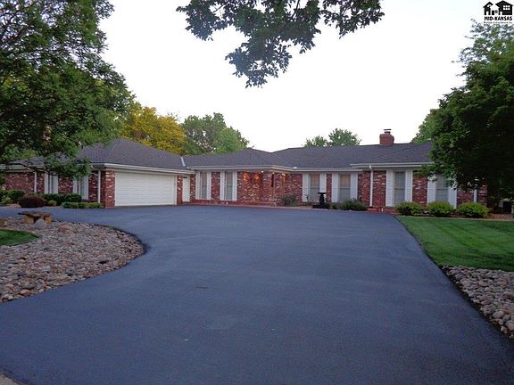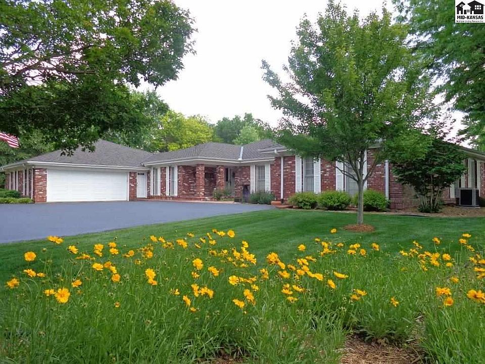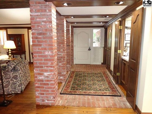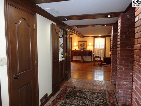 All brick Jost & Wiens built ranch home with many unique features. Foyer brick pillars reflect covered outdoor entry. Great room has brick gas fireplace surrounded by book cases, raised pecky cypress ceiling. There are wood floors in Great Room, Dining Room, Kitchen, and Bedrooms. Office & laundry rooms have ceramic tile. Foyer and back hall have brick floors. 3 bedrooms, 2.5 baths, plus office. Kitchen has pantry, wet bar, & ice machine, opens into the Great Room. Dining Room (open to the Great Room) has french doors to the large brick patio. Separate laundry room w/sink. Large main bedroom has bookcases, new walk-in shower bath, walk-in closet w/dual built-in dressers, & french doors opening to brick patio. 3rd bdrm has built-ins & space for sitting/desk area. Garage is finished with 4 car capacity (2 tandem), plus 2 golf cart spaces w/separate door to rear exit, cedar lined storage closet, & separate storm room. Outdoor fenced and covered storage, small fenced yard, plus larger open professionally landscaped yard. Large brick patio. New IR Presidential shingles in 2019 by Wray Roofing. New gutter covers 2019. Seller is a licensed real estate agent in the State of Kansas.