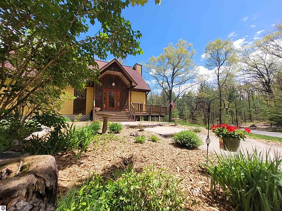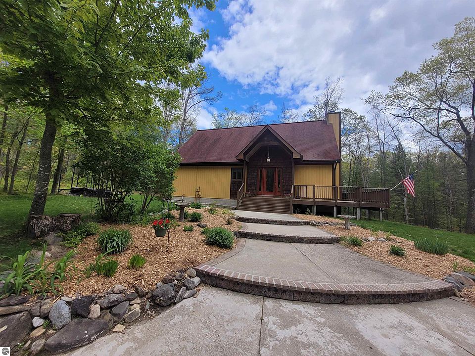 Escape to Your Northern Michigan Retreat — Nature, Comfort & Endless Adventure Await. Welcome to your dream getaway, perfectly tucked adjacent to pristine state land and just moments from the sparkling shores of Fife Lake and Mirror Lake. This beautifully crafted 2-bedroom, 2-bath chalet offers the ultimate blend of rustic elegance and modern amenities — your private oasis in Northern Michigan. Step inside to a warm and inviting open-concept living area, featuring rich hickory floors, a stunning natural fireplace, soaring vaulted ceilings, and a handcrafted live-edge bar. The custom kitchen is a chef’s delight, complete with sleek finishes and a bar fridge to keep your favorite beverages chilled as you prepare meals and make memories. A cozy loft offers flexible space and can easily be converted into a third bedroom. The spacious primary suite is your personal sanctuary, with its own fireplace, walk-in closet, private bath, and a charming deck for enjoying your morning coffee with a view. Need space for guests or rental potential? The separate studio apartment includes a full kitchen and bath—ideal as a guest suite, in-law quarters, or a turn-key Airbnb opportunity. Light floods the home through Anderson windows, framing breathtaking views of nature in every direction. Downstairs, a full basement offers endless storage or finishing potential. Outside, adventure is quite literally at your doorstep. With access to Mirror Lake and mooring rights on Fife Lake, you’ll enjoy fishing, boating, swimming, and relaxing lake days just steps away. Explore nearby hiking and ORV trails through the North Country Trail system, or take a scenic 30-minute drive to vibrant Traverse City. Whether you’re seeking a peaceful year-round residence, an investment property, or a seasonal escape, this unique chalet offers something truly special. This is your chance to own a slice of Northern Michigan paradise. Tour today and experience the magic of this one-of-a-kind retreat.