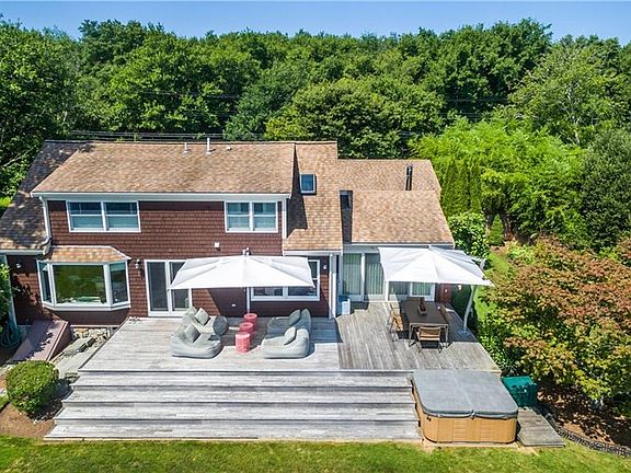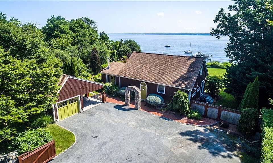 Beautifully sited on about 2/3-buildable acres, with 300 ft of frontage on the East Passage of Narragansett Bay, a deep water dock, rights to 2 moorings, a hot tub and a gazebo by the water's edge with seating and a fireplace, this delightful seaside cottage was totally renovated in 2000. Stone pillars and low-profile gates are a lovely introduction to the courtyard parking area, with a detached garage, covered carport and custom bamboo fencing highlighted by bulls eye tempered glass detail that encloses a private and lovely landscaped yard. An open floor plan showcases the amazing, wide angle water views enjoyed from every room. The home features a chef's kitchen with a center island, granite counters, designer appliances and generous storage, a spacious dining area, living room with a free-standing Swedish fireplace, a family room/study and a master with custom built-in cabinets and shelves and a spa bath with a soaking tub and walk-in shower. This coastal gem offers expansion potential with a 3-bedroom OWTS, existing approval for a guest suite over the garage and the ability to explore building new at a future date. A substantial portion of the northern part of the 1.74-ac property is protected wetlands, a natural buffer and not buildable. The property was just reassessed effective April 20, 2020 and the new taxes and assessment are reflected. Picture perfect.