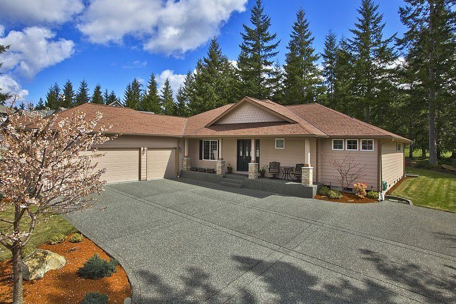 Rare Lakeland Village rambler on the 2nd hole of Generation III Golf Course! Beautifully maintained & well built home with wonderful open floor plan: 5 piece master on one end & guest rooms on other! Features Brazilian Cherry hardwood floors, vaulted ceiling, gas fireplace, formal dining area, heat pump, 3 car garage & more. Gourmet kitchen offers granite counter tops, SS appliances & walk-in pantry. Enjoy private backyard w/covered patio, golf course, territorial & Olympic Mtn. view out front.