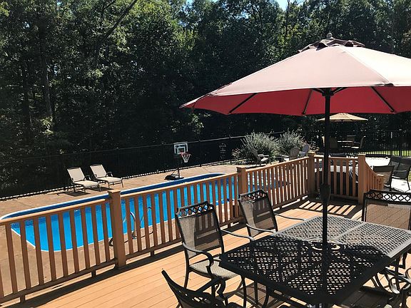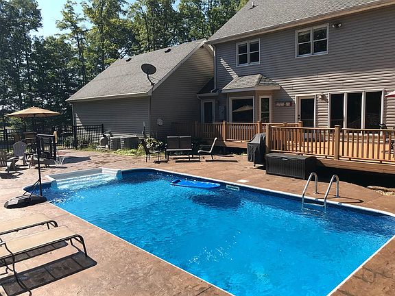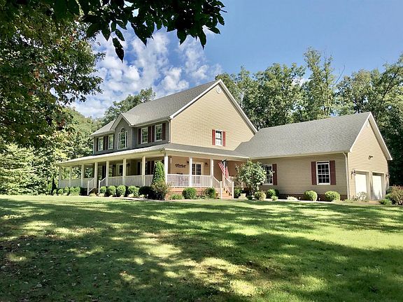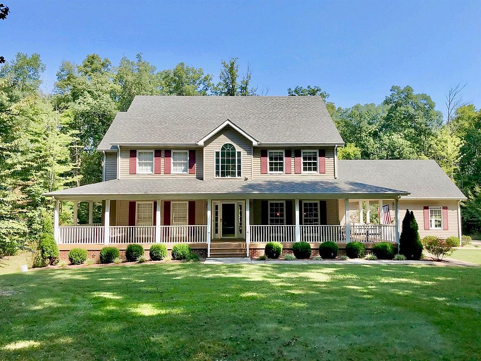 Living is easy at the end of this private tree lined drive. This gorgeous 2 story home with a wraparound porch will welcome you each time. Featuring 4 bedrooms and 3 1/2 baths, a dedicated office with outside access, an open concept living/dining/kitchen, large laundry/mudroom and a full walkout basement with poured concrete walls and high ceilings. The entire back of the house is light and bright with windows and doors opening onto the deck and in-ground pool and welcomes the outside in. You will enjoy the gas log fireplace on those snowy winter days. Not only is the master bedroom massive, every bedroom is very generous in size with large closets. Do you work from home? The office is a dream, spacious with double french doors to the house and the outside to keep your day bright. You will love the walk out basement with the large family room, flex room, 1/2 bath and so much storage you wouldn't believe me it if I told you. All on 5+/- private acres with a stocked pond.