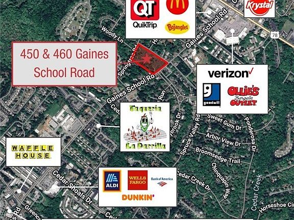 450 & 460 Gaines School Road presents an exceptional opportunity for investors. This versatile property, zoned C-O and RS-15, offers a unique blend of convenience and potential. With access from three streets and high visibility from a traffic count of 16,400 cars per day, the site is ideal for a variety of development projects. Situated just minutes from UGA and Downtown Athens, this relatively level parcel with all utilities represents an exceptional in-fill opportunity for residential and neighborhood commercial uses.
