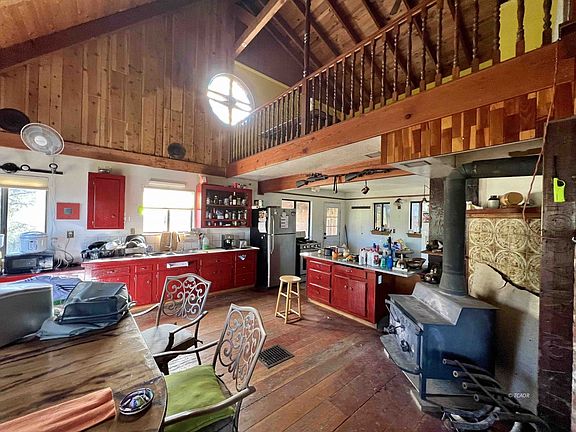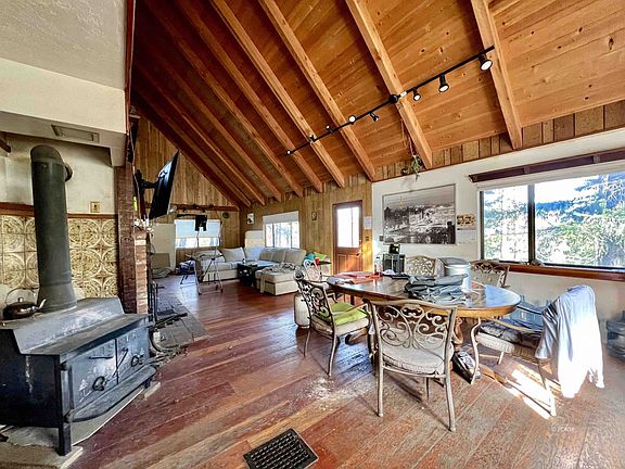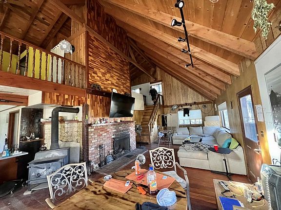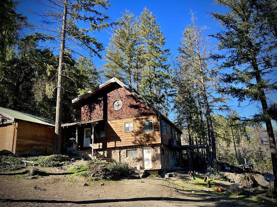 This off-grid 2 bedroom, 1.5 bath home is located just outside of Hyampom on 40 acres. Home has a saltbox style to it, with an open living floor plan, vaulted ceilings, loft bedrooms, and some unique features like redwood accents, stained glass windows, and real wood floors. Over-sized main bathroom has a platform for your custom soaking tub if you choose, or make it into a bright vanity area with vintage windows that let in the light. Finished basement is divided into 2 rooms for cool & secure storage space. Detached garage for additional storage. Property is mostly steep but has multiple flats created for more garden areas or future development. Visit the flat down near the creek in the summer for a relaxing afternoon listening to the sound of the waterfalls while enjoying a game of horseshoes. Many large rock outcroppings & formations can be found around the land for exploration fun. A beautiful view of the surrounding mountains and the South Fork of the Trinity River below, all while having complete privacy. While this home and property may need a little TLC, it has all the potential of being your mountain paradise!