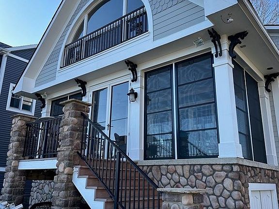 Lakefront home with a sandy beach on Lake George. Quality built and meticulously maintained! Two story home with a finished daylight basement provides plenty of room for entertaining. Spacious island kitchen with pantry, built-in desk, quartz countertops, tile backsplash, custom cabinets with glass panels and individual lighting. Living room features a custom fireplace and access to the lakeside screen porch with custom fireplace. Owners suite has his & her bathrooms with a shared shower, two walk in closets a custom fireplace and access to a private screen porch. The finished daylight basement has a nice storage area with built in cabinetry. 240 sq. ft. of basement storage with exterior door is lakeside. Hardy Plank siding, custom stone, security system & more.