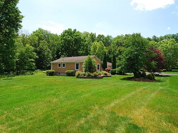 Move right into this gorgeous 3 BR ranch on 3.41 park-like acres backing to scenic woods and protected forest land. Double the square footage and living space with a full, finished basement. First floor: Beautifully updated kitchen with Silestone countertops and ceramic tile floor. Three large bedrooms, two full baths, built-in closet organizers in each BR plus MBR walk-in. Hardwood floors throughout with designer inlays in the living and dining rooms. Lower level: Huge great room features a hand-crafted built-in bar, another full bath, laundry, and 3 more versatile rooms. Paver walkways and large rear patio. Oversized attached 2-car garage with sturdy built-in storage and shelves. Ample parking and minutes to schools from K-12.