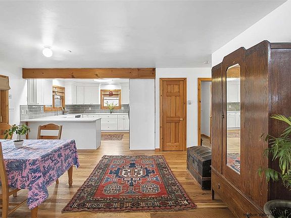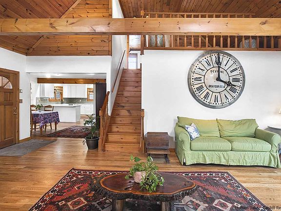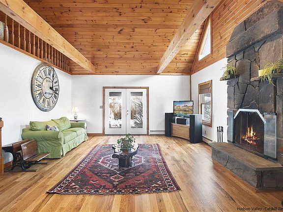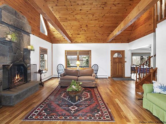Ideally located on a quiet road in Neversink, this light, bright home with extensive well-established landscaping, has a large living room with a fireplace and cathedral ceiling. French doors open out onto a private outdoor patio area. The dining area has glass sliding doors out to the covered front porch, and is open to the completely new kitchen. The clean white and gray color scheme is paired with Shaker style cabinetry, loads of quartz counters and new appliances to create a dream area for culinary explorations. 2 generous bedrooms with a full bathroom are included on this level. Upstairs, is an ideal mezzanine-style office/study space before you are led into a spacious master bedroom with en suite bathroom & French doors that open onto a private screened porch with expansive views. The full basement has been thoughtfully finished, with a full bathroom & generous living space. A double detached garage with single room upstairs completes this turnkey property.