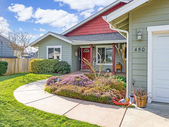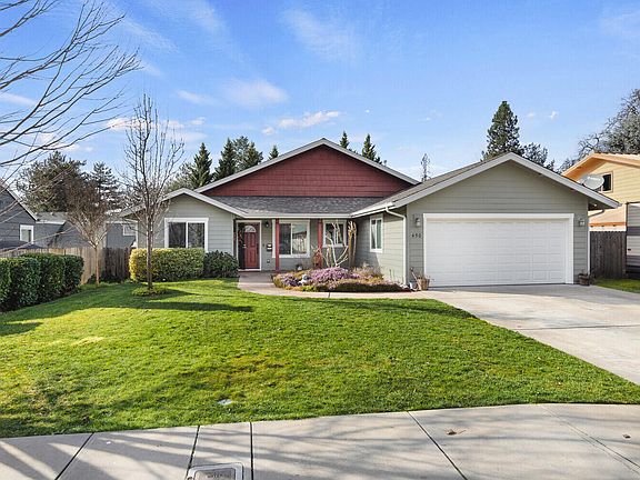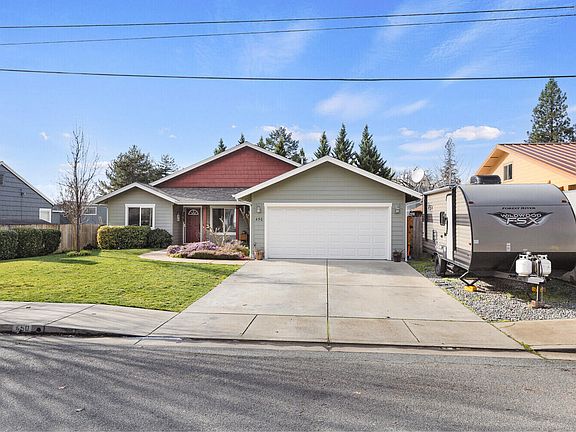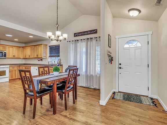 Nestled on a generous lot with convenient RV parking, this charming home has everything you've been looking for! A pathway through the nicely landscaped front yard guides you to the inviting covered porch. As you step inside, the great room welcomes you with its soaring vaulted ceiling and sliding glass door leading to the covered patio with electric sunshade. The kitchen boasts a gas range, built-in microwave, large sink, and dishwasher, complemented by ample counter and storage space, and seamlessly flows into the dining area. The spacious primary suite offers a walk-in closet and ensuite with step-in shower. The laundry room, complete with a counter and upper/lower cabinets, provides access to the 2-car garage. The two guest bedrooms are separated by the guest bathroom with a single sink and tub/shower. The expansive backyard features apple trees & blueberry bushes, side yard/dog run w/ storage shed, and recently installed energy-star certified outdoor HVAC unit. Come see it today