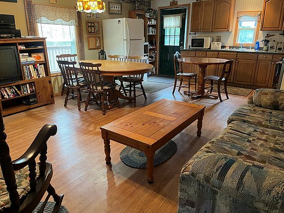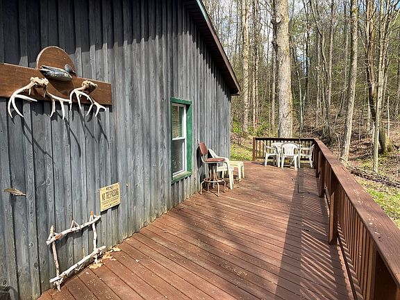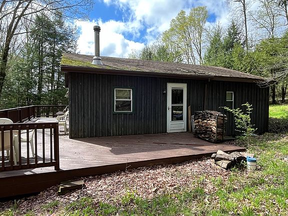 Situated on one acre with wooded acreage as a backdrop, the 864 sq ft, one level, two bedroom, one bath, is ready for your weekend get a ways! The kitchen and adjoining living area can handle a crowd, the 3/4 bath and two bedrooms will contribute to the conveniences needed. The large wrap around deck is great for viewing wildlife. There is well, septic and electric all present on the property and the home is heated with woodstove in the living room. All remaining furnishings and household items stay with the property. CASH Buyers only. Exterior cameras are on the property. Please only view with an agent. Taxes are 1185.28