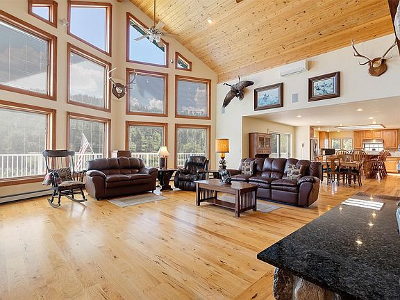 Step into the main level living area and be greeted by the awe-inspiring vaulted ceilings that not only enhance the visual appeal of the interior but create a remarkable sense of spaciousness and grandeur. Your gaze will naturally be drawn upward towards the breathtaking views of the majestic mountains, perfectly framed by the vertical expanse. The heightened ceiling allows for improved air circulation and the abundant natural light floods the space, contributing to an inviting and comfortable atmosphere. As you bask in the serene ambiance, the floor-to-ceiling windows in the living room accentuate the tranquility and are complemented by the magnificent custom-built wood-burning rock fireplace. The main and lower-level decks that wrap around the home provide multiple vantage points to savor the surrounding vistas.