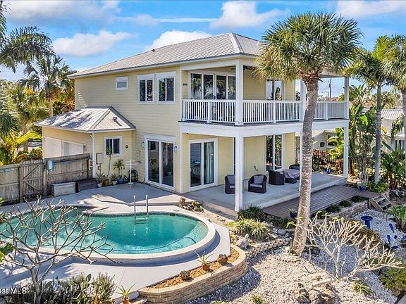 Built in 2012, this canal-front pool home offers direct, deep-water access just 300 feet from open water on Sykes Creek. Dolphins and manatees are regular visitors, adding to the everyday appeal of waterfront living. Boating is effortless with a new dock, 10,000-lb boat lift, covered boathouse, 75' seawall, 6' depth, and 50-amp service. The upper level features the primary suite with double vanities, soaking tub, glass shower, & a large walk-in closet. Open-concept living and dining connect to a chef's kitchen with extensive cabinetry and open to a 384 sq covered balcony with wide water views—ideal for mornings and evenings overlooking the water. Downstairs includes two bedrooms, a full bath, a living area with kitchenette, & indoor laundry. Sliders open to the covered porch and pool area, creating flexible space for guests or everyday living. Outdoor areas include 384 SF covered porches on both levels, an open-air free-form pool with newly stained decking, Solid construction with ICF (insulated concrete form), metal roof and impact windows and sliders, keeping insurance costs to a minimum.