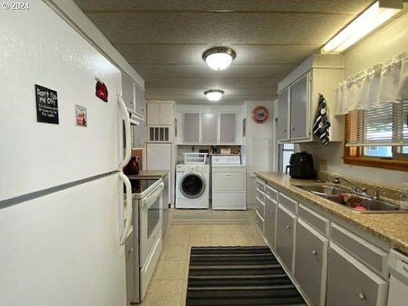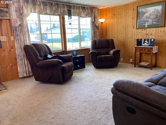This home is a pleasure to show. Knotty pine paneling in living rm & dining area. Vinyl windows in living rm. Carpet has been updated, as well as lighting in kitchen & primary bdrm. Wrap around membrane roof. Fresh exterior paint. Partial Underground sprinklers west side of home. East side is nice-sized w/room for a small garden. Covered dbl carport. Corn hole area. Park rent includes dog park, swimming pool & clubhouse. RV Storage available. Close to tennis, pickleball courts & community center. 55+ park.