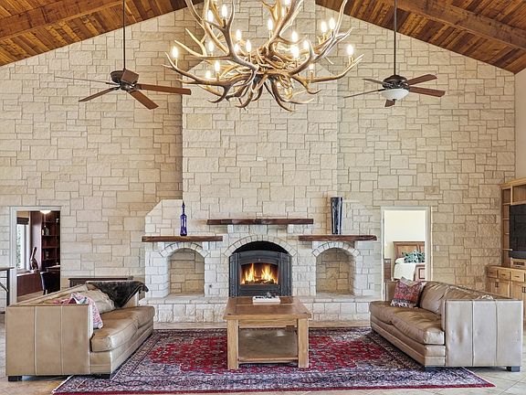 Immaculate custom stone home on 30 acres of Texas Hill Country beauty with stunning Lake Buchanan views! Built by Tommy Long, this one-level home offers a soaring great room with a massive stone fireplace, open dining, and a wall of windows that invite the outdoors in. The chef’s kitchen features a large island with prep sink, double ovens, warming drawer, microwave, cooktop, and a walk-in pantry that doubles as a safe room. Primary suite offers patio access, spa bath with soaking tub, dual vanities, walk-in shower, and huge custom closet with built-in island. Private office/library with built-ins, split plan with guest bedrooms and porches, powder room, and generous laundry with sink and storage. 3-car garage with solar panels for efficiency. Outdoors: raised stone garden beds, rainwater system, stocked koi pond, wraparound porches, and 1,200 sq ft metal building. Peaceful sunsets and panoramic Hill Country views complete this incredible property near Marble Falls & Burnet!