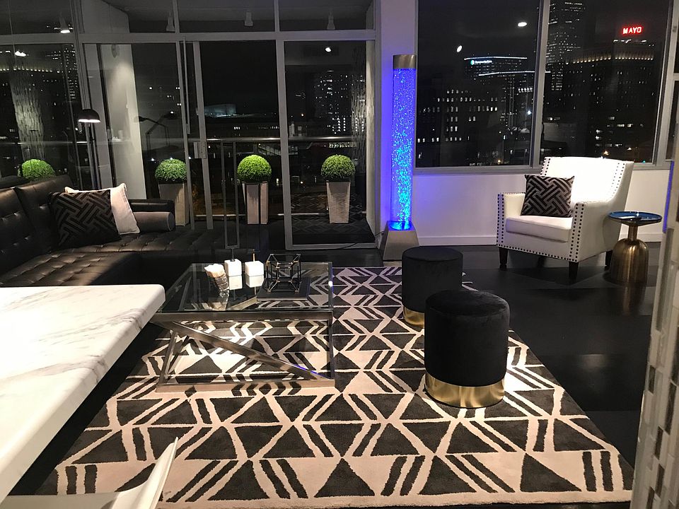 $1400.00 BEAUTIFULLY FURNISHED AND ALL BILLS PAID. FREE WIFI/ INTERNET. Modern one bedroom highrise with an open floorplan, wall to wall windows, balcony and incredible skyline views. Stunning mirrored walls and custom designed concrete floors make this a one of a kind living space. The kitchen has modern cabinetry and appliances. Amenities include wifi, pool, jacuzzi, gym, basketball and tennis courts, jogging track, 24 hour security and covered parking and is pet friendly