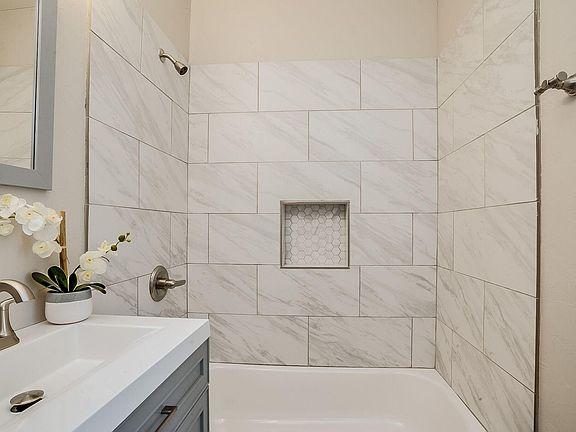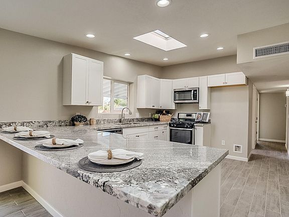 This home is a true gem. It has been remodeled to perfection. This 5bd/2ba home offers a open floor plan with large great room with wood tile planked floors, gorgeous kitchen with granite counters under mount sink, stainless steel appliances, new white shaker style cabinets with a huge peninsula island that can easily seat 4-6 adults. Great dining area. Guest bath with Carrera styling shower surround. New vanity and mirror. The master bath offers a resort style shower tiled from floor to ceiling with rain shower head and shower wand. The backyard offers ample space and privacy with its tall brick walls that go around the entire property. the home has a new 200 amp panel, new a/c furnace, and roof comes with 2 yr warranty. All work was permitted. Agent/Owner
