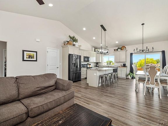 Beautiful home located in the heart of the Golf Course Area of Pueblo West. This lovely Ranch style home is only a few years old. As you enter the home, you are greeted w/ vaulted ceilings, a Grand open floor plan with a spacious Living room, and a classy Kitchen/Dining room area. The Kitchen includes clean white cabinetry w/ Soft Close drawers, Granite counter tops, a large island bar area (seats 4), black stainless steel appliances, and an enclosed pantry. With this split floor plan there are 2 bedrooms on one side w/ a full bath. On the opposite side of the home, there is a spacious mud room/transitional area just off the kitchen that can accommodate a desk or storage area and has access to the garage. The laundry room is on the way to the Master Bedroom and has ample storage. The Master bedroom has a nice barn door accent leading into the bathroom. There is a roomy walk-in shower, 2 separate sinks, and a nice walk-in closet in the Master Bath. Explore the Full unfinished basement, which is great for storage or your future plans. (Insulation is complete and the home is plumbed for another bathroom). The attached garage has 3 bays on the exterior, but was made to fit 4 vehicles with the extra long extended 3rd bay. Front yard is landscaped w/ rock for easy maintenance and the back yard is a blank slate to be finished to your liking. You will see Personal touches from top to bottom throughout this home! Close to all area amenities and nearby biking/walking trails.