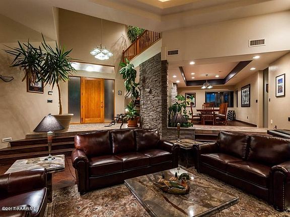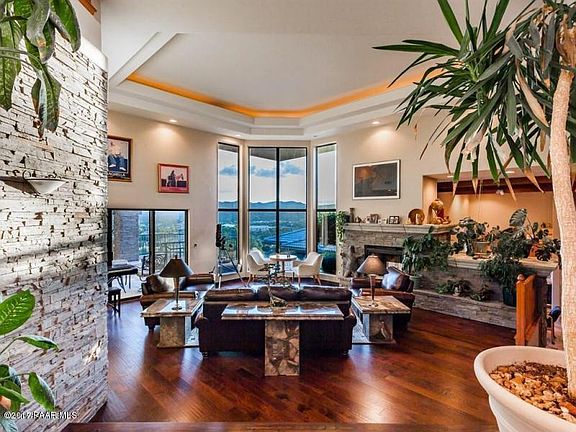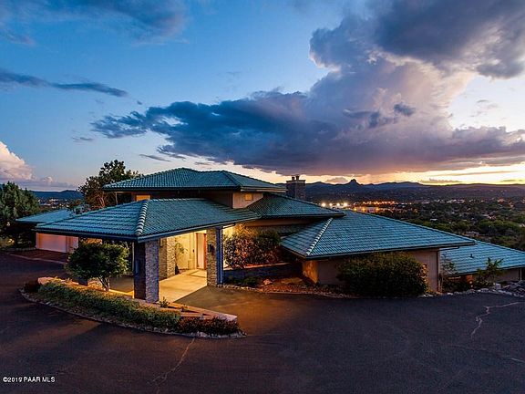 Split, split, split parcel into 3 lots if you want to reduce price. Looking for rare and unusual executive estate? Take a serious look at this residence located in the heart of Prescott on a 5-acre hill top withviews of the surrounding community. The home was built to maximize the viewsfrom all parts of the house. The interior is of very upscale quality and design. The floor plan lends itself to be very versatile depending on your life style.Some of the features inside are: Beamed ceiling, Fans, Central Vac,Granite counters, eat-in kitchen, gas and wood fi replaces, formal dining,Garden tub, ceilings 9', spa/hot tub,walk-in closets. Exterior features are covered and open decks, landscaping terraced with planter, grass, automated watering, paved drive way. Guest house 353 SQ.ft